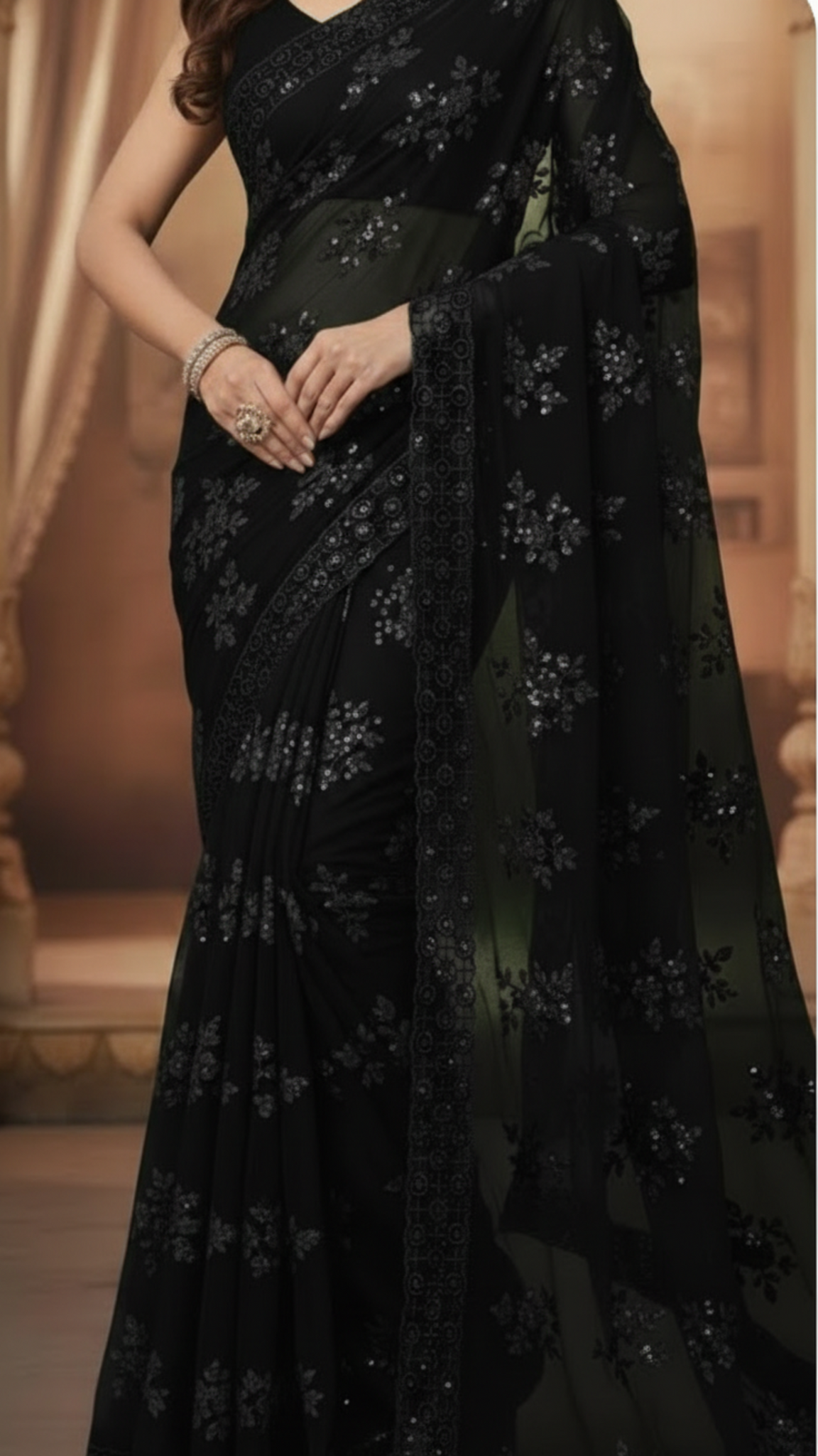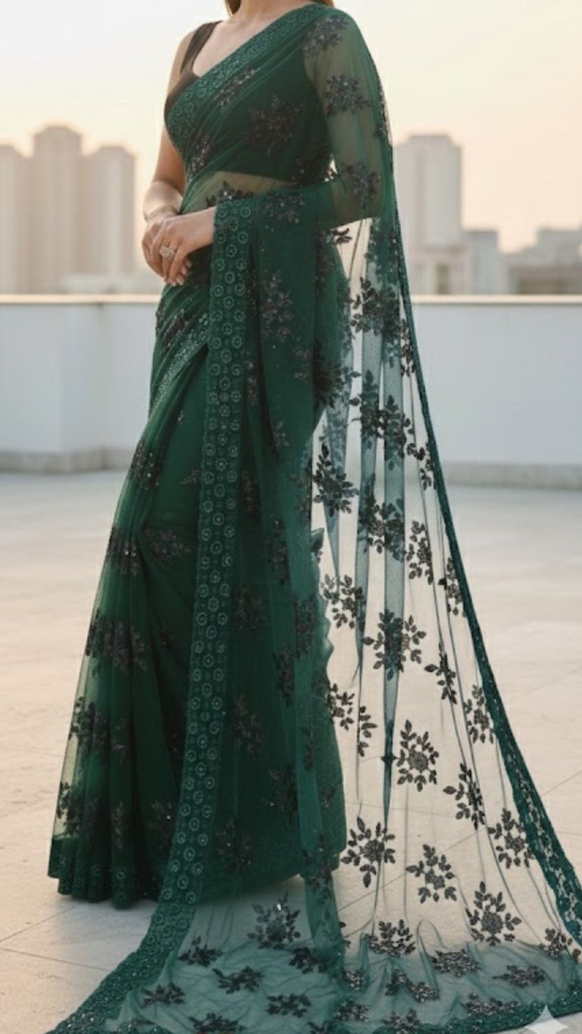 A stunning Luxe Net saree with refined black embroidery, designed for graceful evenings and special celebrations.